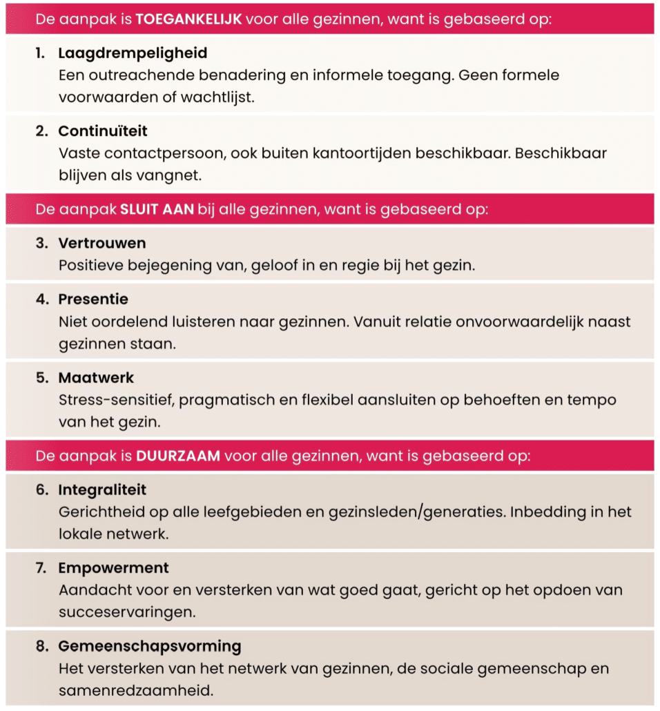 Tot en met oktober 2021 zijn in totaal 847 gezinnen ondersteund. Daarvan zijn 336 gezinnen intensief begeleid, en 511 kortdurend. Uit het onderzoek blijkt dat alle gezinnen die intensief werden begeleid, uit de acute nood kwamen en vooruitgang boekten op de achterliggende problematiek. De geïnterviewde ouders zijn bovendien meer gaan participeren in groepsactiviteiten en doen meer aan vrijwilligerswerk. De complexiteit van de problematiek binnen de gezinnen is erg wisselend en voor sommige gezinnen is gebleken dat het voorkomen van het verder afglijden van het gezin het hoogst haalbare doel is. Voor hen geldt dat, door de zwaardere problematiek, langdurige steun nodig zal zijn.